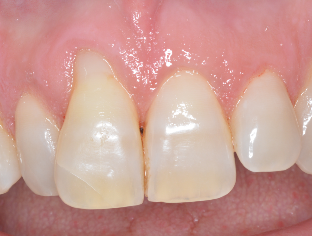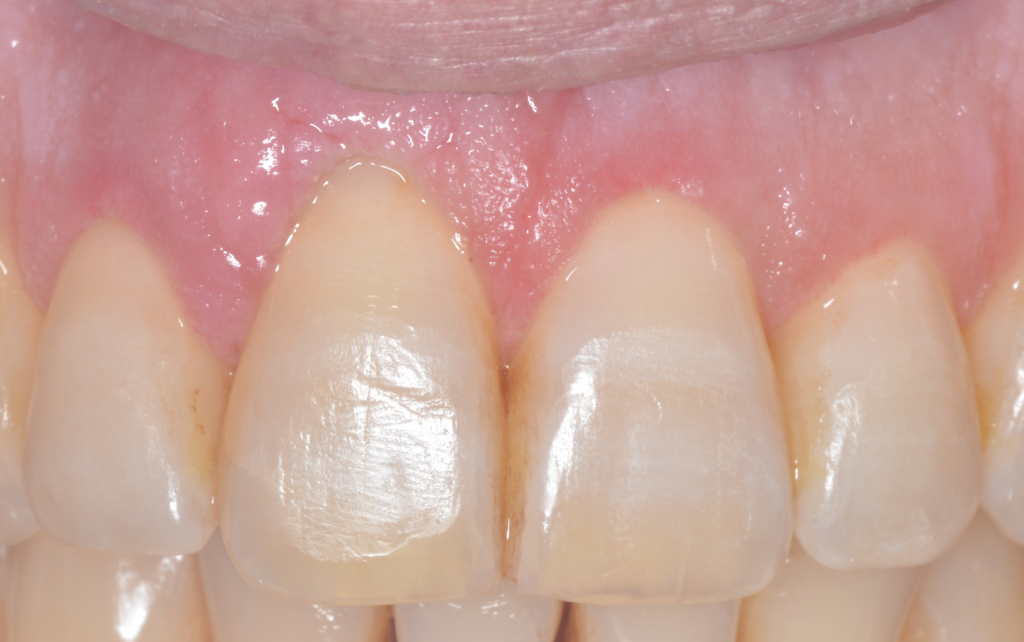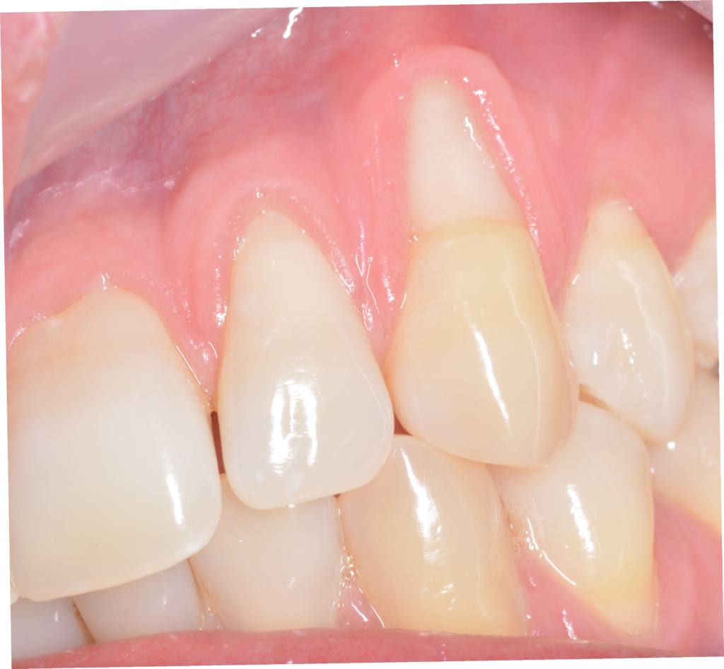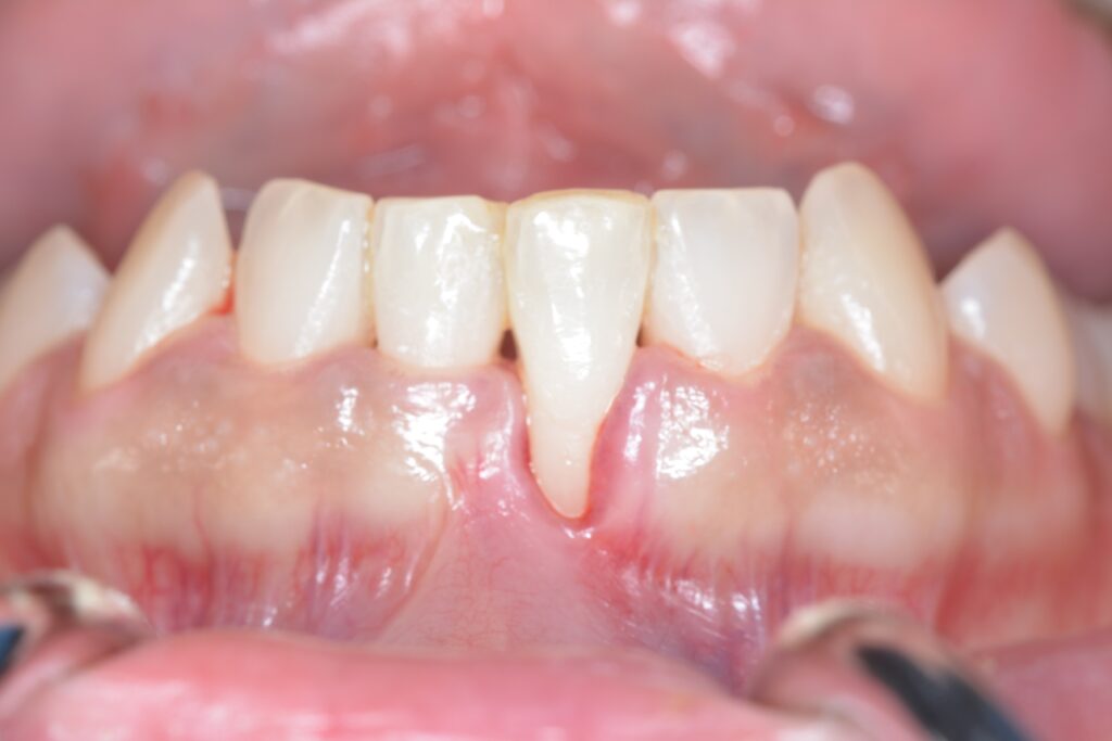 - Gum recession is visible in the smile and leads to a tooth that looks unnaturally large.